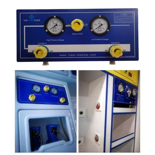 Denne Ambulance Medical Gas Manifold -enheten er egnet for ambulanser med høyt oksygenforbruk. Den legger inn oksygen med høytrykks oksygen gjennom metallslange til kontrollpanelets hovedrørledning, og oksygenet med høyt trykk blir levert til oksygenterminalen gjennom lavttrykksrørledning etter depressurisering som skal brukes som oksygenkilde til førstehjelpsbruk. Arbeidsprinsippet er å dekomprimere oksygenet med høyt trykk i lavt trykk og levere det til oksygenterminalen gjennom den respektive rørledningen, for å levere oksygenterminalport og ventilatorport. Kontrollpanelet kan kobles til to eller flere oksygensylindere samtidig for å dekomprimere flaske med høytrykks oksygen til et visst trykk, som er en slags utstyr for sentralisert gassforsyning. Kontrollpanelet består av en høytrykksrørledning laget av metallslange, som er koblet til oksygensylindrene gjennom G5/8-tråder. Hver oksygensylinder er koblet til kontrollpanelet med en tilsvarende høytrykksventil, som styrer den respektive høytrykksrørledningen. Høytrykksrørledningen som forbinder hver oksygensylinder i bakenden av koblingsventilen er koblet til hverandre, og manifolden er utstyrt med en tee-kontakt midt i manifolden for å koble høytrykksmåleren, regulatoren og høytrykks-rørledningen i serier. Høytrykksmåleren brukes til å overvåke oksygentrykket i høytrykksrørledningen til kontrollpanelet, og regulatoren brukes til å regulere oksygenet med høyt trykk til det nødvendige trykket og deretter gi ut til lavtrykksterminalen. Lavtrykksenden er koblet til oksygenterminalen, sikkerhetsventilen og lavtrykksmåleren, som brukes til å overvåke trykket i lavtrykksrørledningen til kontrollpanelet, mens sikkerhetsventilen automatisk uttømmer gassen når utgangstrykket er høyere enn designtrykket, for å sikre sikkerheten og stabiliteten til utgangstrykket. Dette systemet er egnet for ethvert sted der bytting av gasskonvergens er nødvendig for å overvåke gasstrykk og gass gjenværende mengde, for eksempel: sykehus, ambulanser, petroleum, flytende petroleumsgassstasjoner og andre industrielle og gruvebedrifter og institusjoner.