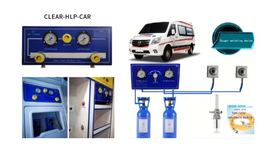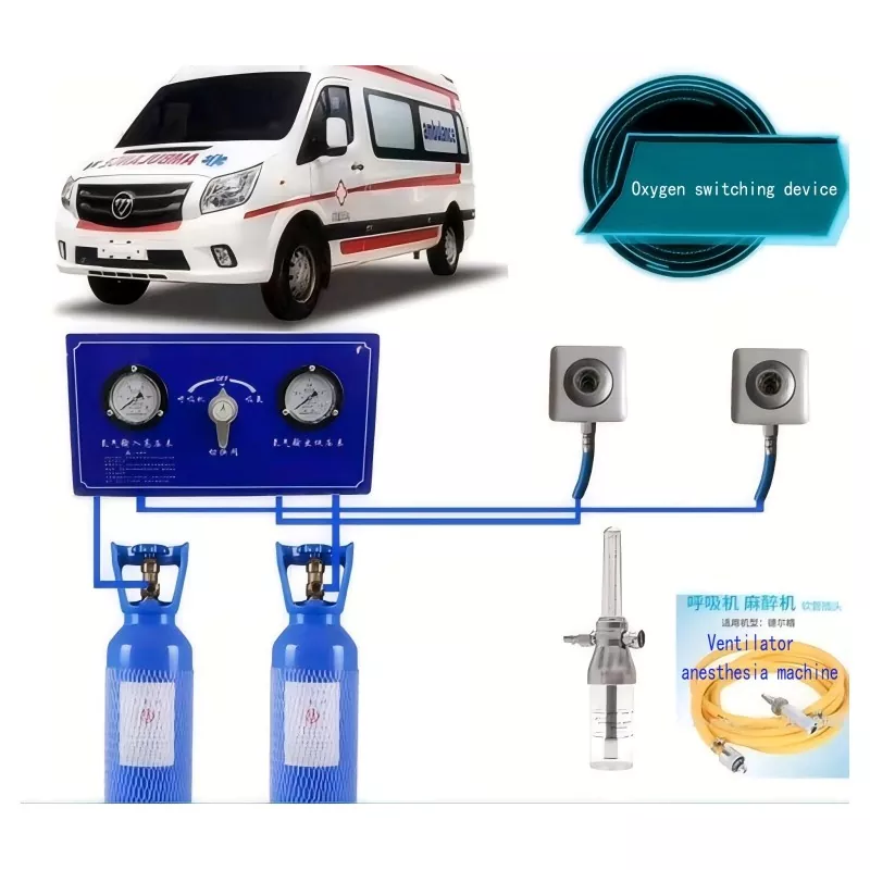 1. Denne enheten er egnet for ambulanser med stort oksygenforbruk. Det flaske høytrykks oksygen blir lagt til hovedrøret til kontrollpanelet gjennom en metallslange. Etter at oksygenet med høyt trykk er redusert, transporteres det til oksygenterminalen gjennom et lavtrykksrør, som brukes som en oksygenkilde for nødbruk. Arbeidsprinsippet er å dekomprimere oksygen med høyt trykk til lavt trykk, henholdsvis gjennom sine egne rørledninger til oksygenterminalen, til oksygenterminalen og ventilatorporten for bruk.